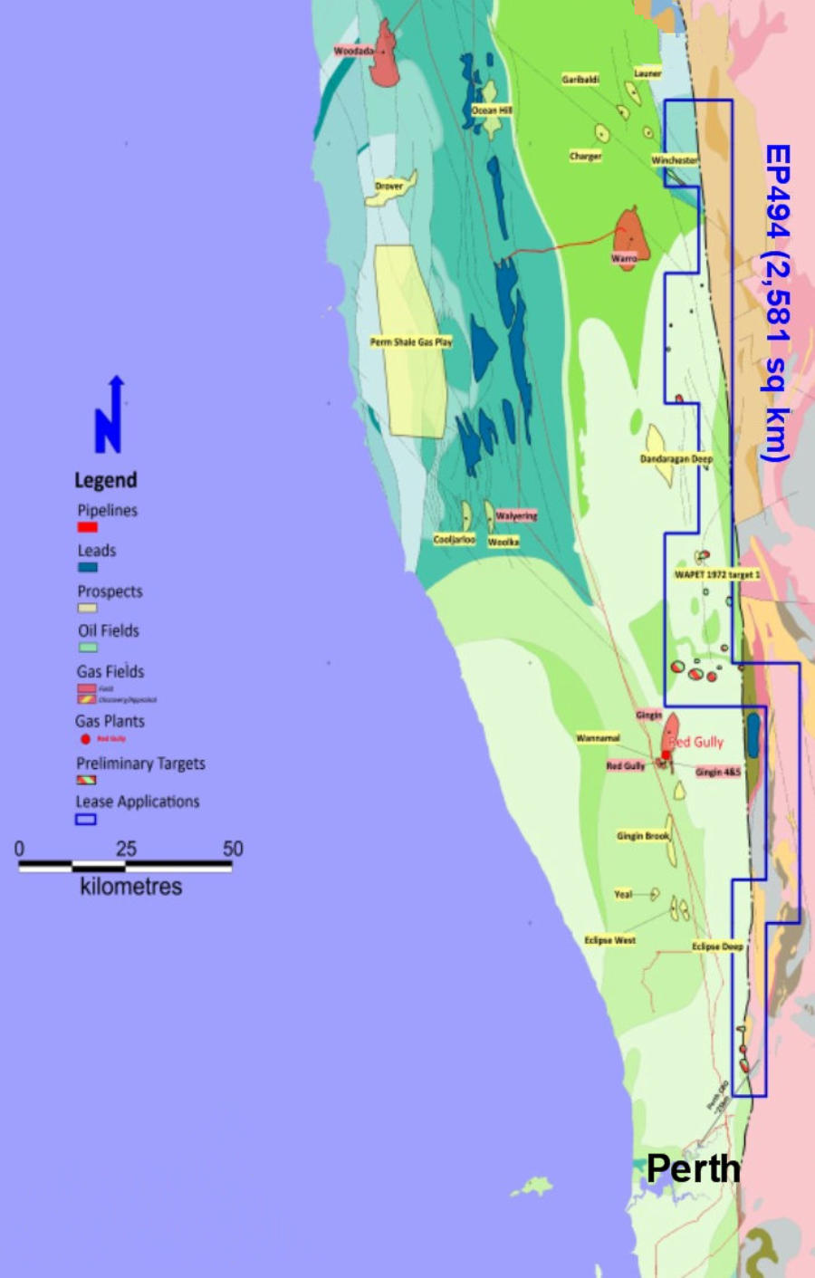 The Dampier to Bunbury Gas Pipeline and the Red Gully Gas Plant are close to EP 494 which will allow for the ready commercialization of any discoveries